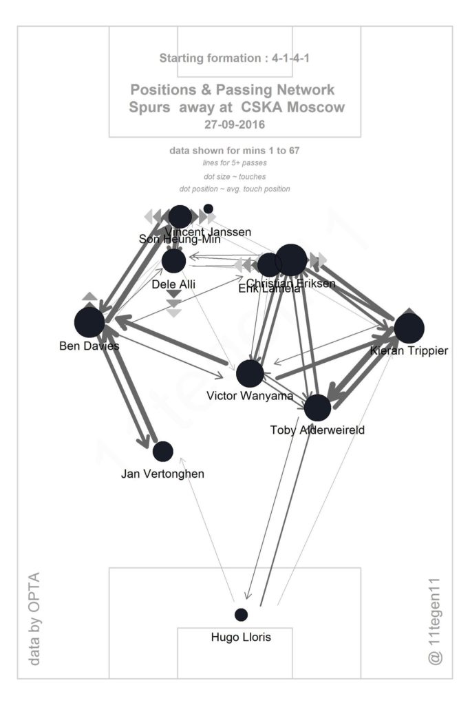 This shows player influence. The larger the player’s name, the larger the influence. Of course, don’t let yourself be tricked by the fact that “Son Heung-Min” is simply a longer name than “Dele”… it’s the size and thickness that matters here (grow up). What is interesting is how Son plays the entirety of the first half out on the left side, his usual flank of late – but Pochettino, visibly realizing that Son is an incendiary, havoc-wreaking asset – tests him out on the right, probably looking to exploit a weakness in the Moscow backline. When that didn’t