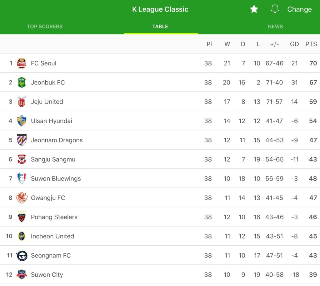 This sets up a promotion playoff over two legs between Seongnam FC and Gangwon FC. The first leg will be held in Gangneung on November 17th, and the return leg is at Tancheon Stadium on November 20th. Will Gangwon return to the Classic thanks to Brazilian firepower (somebody buy their scouts a soju). Or will Seongnam ensure a 28th consecutive season in the top division?