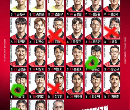 • In: Hwang In-beom, Son Heung-min, Paik Seung-ho, Hwang Hee-chan, Na Sang-ho, Lee Kang-in, Kwon Chang-hoon, Jeong Woo-yeong, Son Jun-ho