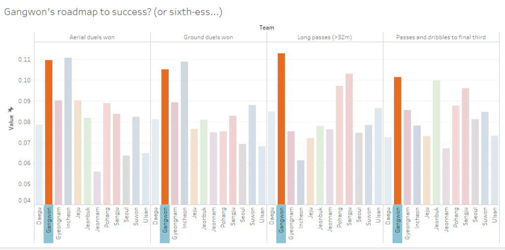 It’s a well-established fact that K League teams tend to play more on the direct side, especially when they have a dearth of talent. Gangwon is no exception, except they just seem to do it much better than the others. In the past six games, they’ve won the 2nd the most aerial duels and ground duels in the league, and made the most long balls and penetration of the final third (presumably with all of these long balls).