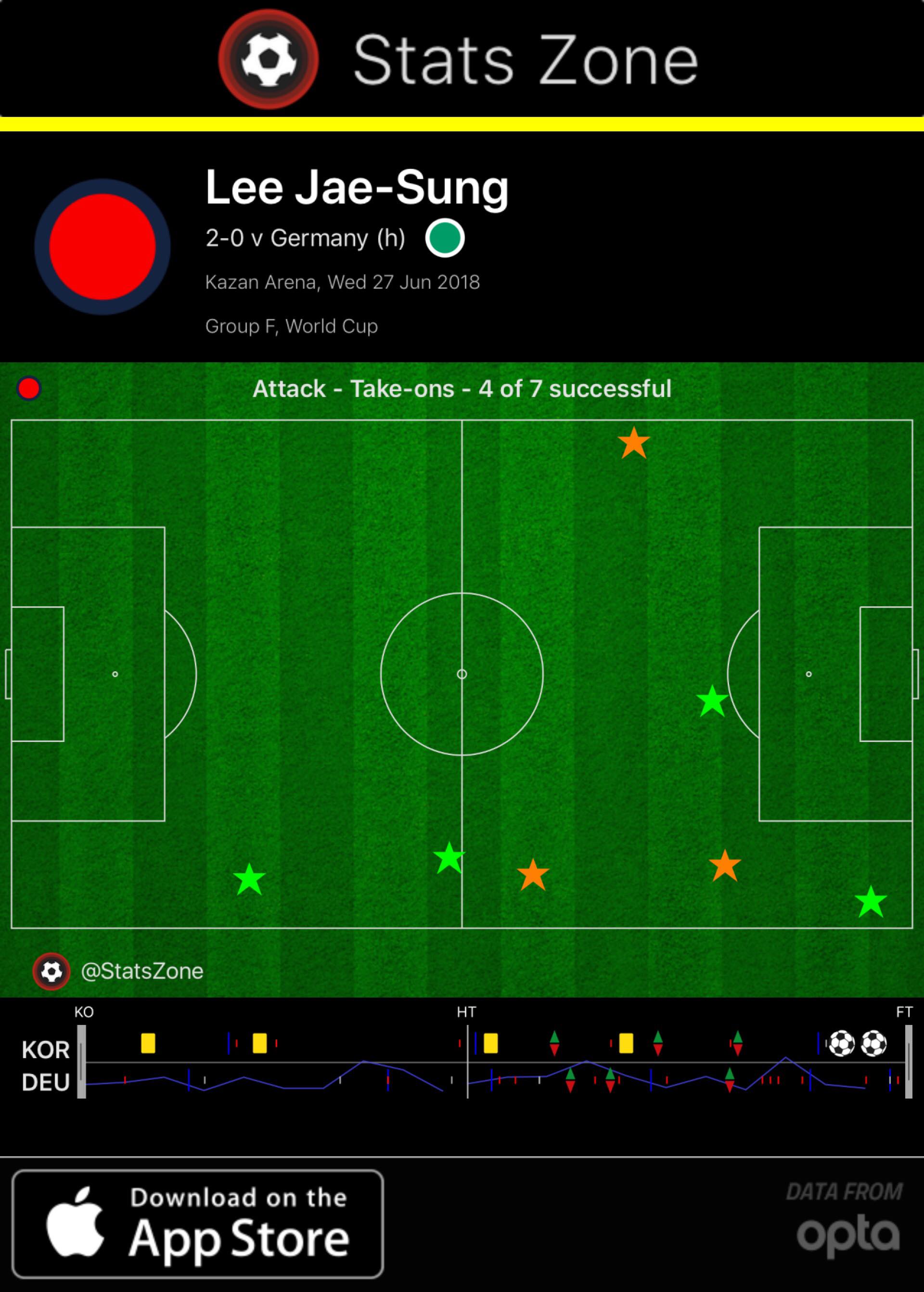 Take a look at this little chart of his efforts against Germany at the 2018 World Cup, where Lee exploited Hector, attempting 7 take-ons and succeeding in a game-best 4 take-ons.