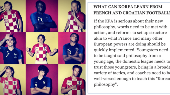 It was a World Cup final for the record books. 6 goals, endless drama and two excellent teams going the distance. At the end of the day, one team goes home hoisting the trophy, while the 31 others — and indeed, the entire footballing order — conduct macro- and micro-level examinations of how to improve and emulate the success of the world’s best. So, let’s take a look at some examples where Korean football can benefit from studying and learning from this year’s World Cup finalists.