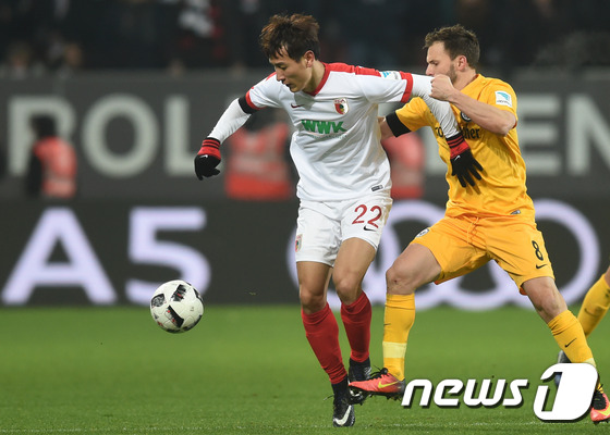 Augsburg’s South Korean forward Dong-Won Ji (L) and Frankfurt’s Hungarian midfielder Szabolcs Huszti vie for the ball vie for the ball during the German first division Bundesliga football match between FC Augsburg and Eintracht Frankfurt at the WWK-Arena in Augsburg, southern Germany, on December 04, 2016. / AFP PHOTO / CHRISTOF STACHE / RESTRICTIONS: DURING MATCH TIME: DFL RULES TO LIMIT THE ONLINE USAGE TO 15 PICTURES PER MATCH AND FORBID IMAGE SEQUENCES TO SIMULATE VIDEO. == RESTRICTED TO EDITORIAL USE == FOR FURTHER QUERIES PLEASE CONTACT DFL DIRECTLY AT + 49 69 650050