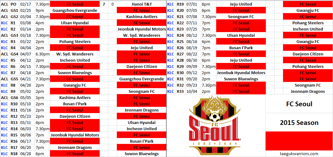 Seoul’s Asian Champions League group sees them play against Guangzhou Evergrande Taobao and Western Sydney Wanderers. Both these teams are responsible for Seoul’s exit in the past two ACL’s – in 2014, losing to WSW in the Semi-Finals, and in 2013, losing to Guangzhou in the Finals.