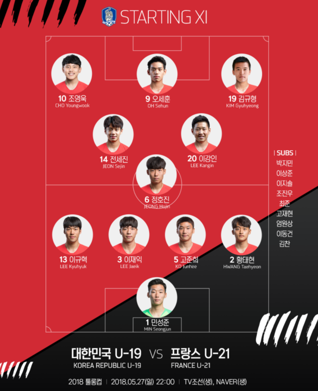 “It was not an easy game for Korea. The phsical condiiton and focus was not at 100%. France qiuckly found exposed spaces and took their chances, scoring as early as the 4th minute. Korea never really got back into the game, with the defense constantly allowing French players to run in behind them, and conceded again in the 8th…. though their play wasn’t perfect, Korea coudln’t capitalize on their mistakes. In the 35th minute Kim Gyuhyung was replaced with Uhm Wonsang, who displayed his speed on the left flank and got a few shots on target. Lee Kangin started to impose himself on the game as well, and Korea started to improve before the start of the second half. At halftime, Jung Hojin was taken off for Daegu’s Ko Jaehyun. Within 30 seconds of the second half, Jeon Sejin found a long range shot, and the momentum carried on, eventually leading to Lee Kyuhyeok getting fouled in the area and Cho Youngwook burying the PK. But France did not relent, and within 6 minutes found their first shot of the second half. In the 49th minute and 57th minute, France had scored their 3rd and 4th goals.”