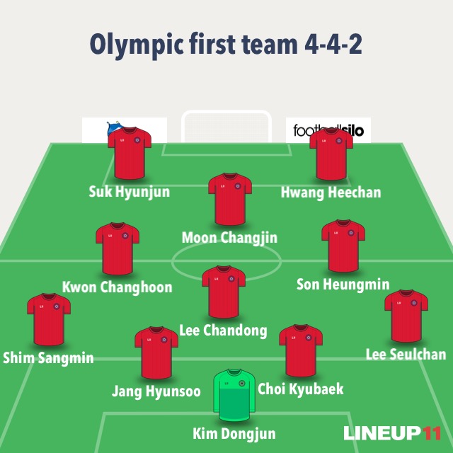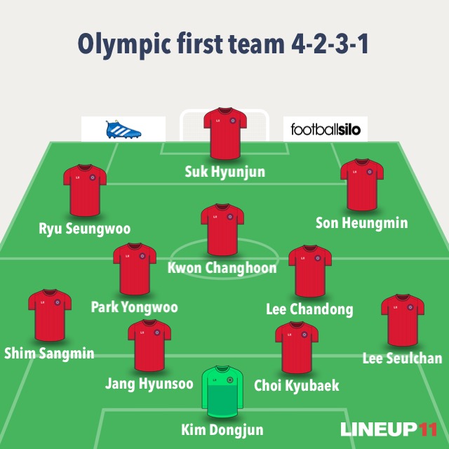 Jinseok’s starting XI – a more offensive formation. I don’t believe in 1) Kwon Chang Hoon playing wide and 2) Ryu Seung Woo starting. That central midfield spot could really go to either Lee Chang Min, Park Yong Woo, or Moon Chang Jin. A lot of that would really depend on their club form going into the Olympics, but for now I chose LCM because 1) he adds more creativity than Park Yong Woo would and 2) MCJ isn’t in the best of form right now. Perhaps a more defensive option would be to go 4-2-3-1 with one of HHC or SHM as an impact sub (probably HHC) with Kim Seung Jun as the replacement.