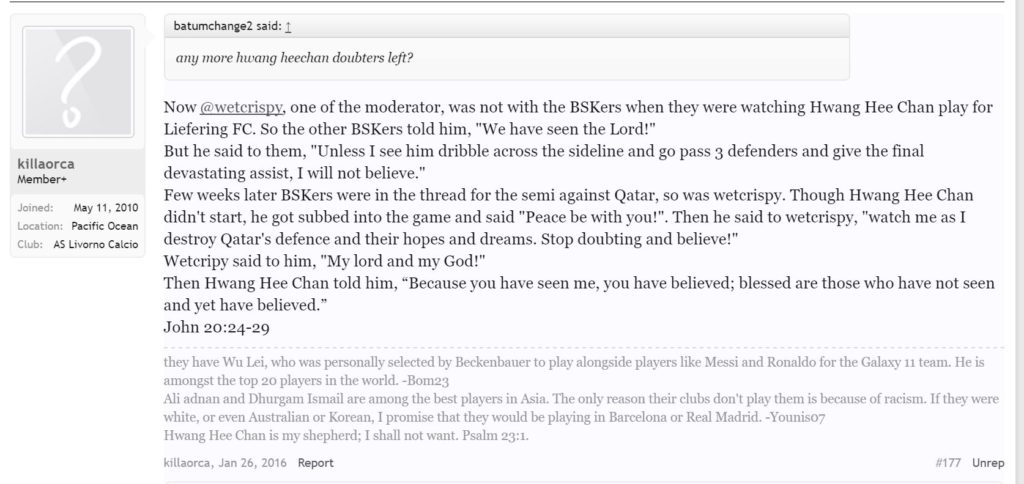This guy got so much hype after the 2016 AFC U22 Championship (much of it deserved, imo) that Hwang Hee Chan was officially christened the BigSoccer Korea’s Messiah. This remains one of my favorite posts so far: