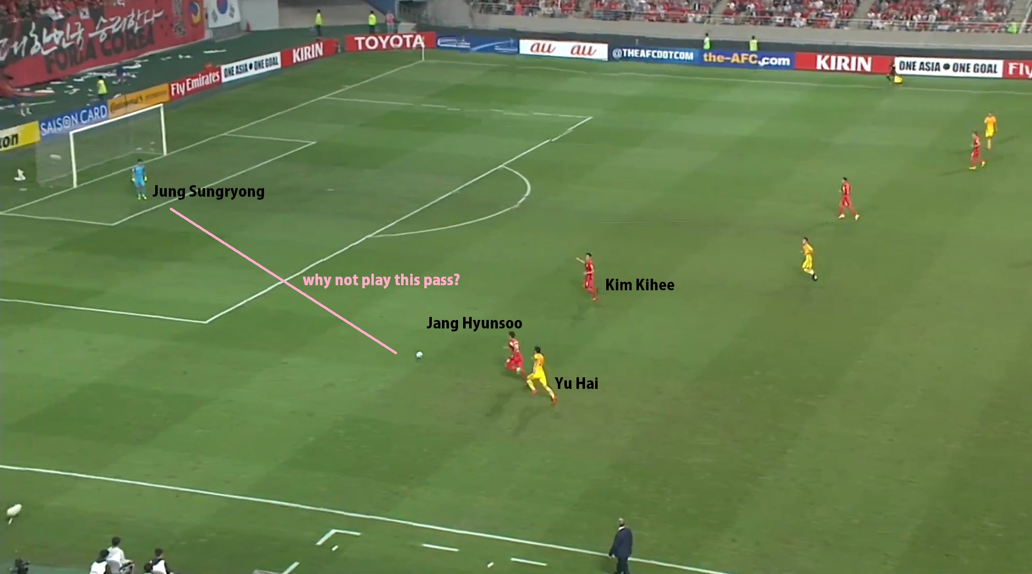 Jang’s chasing down a free ball. Yu Hai is pursuing him. Kim Kihee is pointing at Jang to play a simple pass to Jung Sungryong.