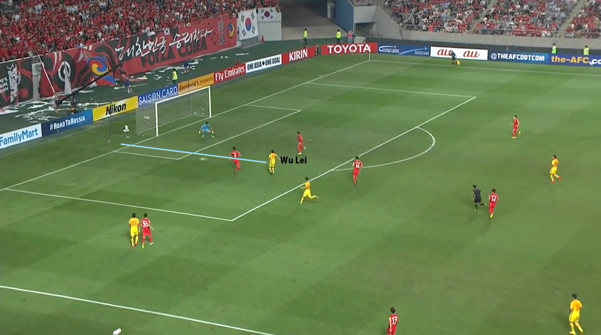He and Son dialed into second gear, and the former Korean captain tried to play a pass to Son, who was bursting into the channel in behind China’s 3 midfielders. However, they weren’t on the same page and Chinese central centreback Zheng Zhi got the ball. Because Koo was out of position, there was plenty of space for a couple of passes before Yu Hai releases Wu Lei’s run.