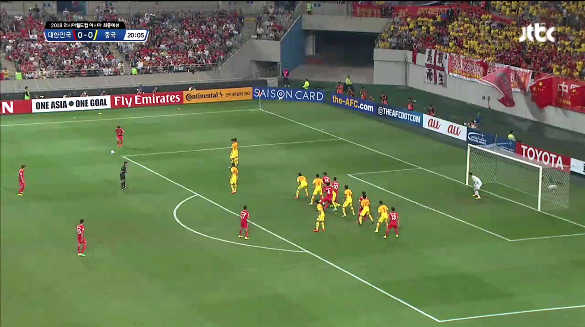 The subsequent free kick. China is employing a zonal marking system with a two man wall. Jang Hyunsoo and Ki Sungyueng look slightly offside, but as the ball is delivered, it seems that the real problem for China here is how slow they are out of the gates. Perhaps they are expecting a looping ball instead of the pacey, header-level delivery of Son.