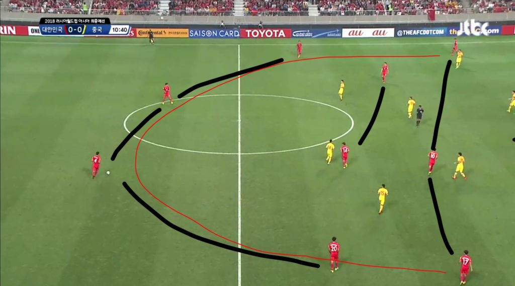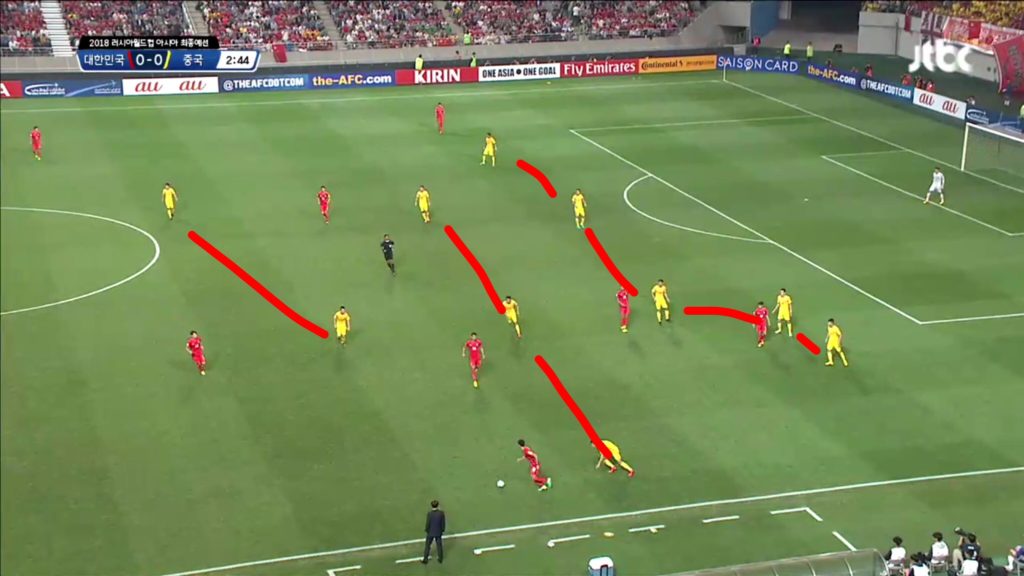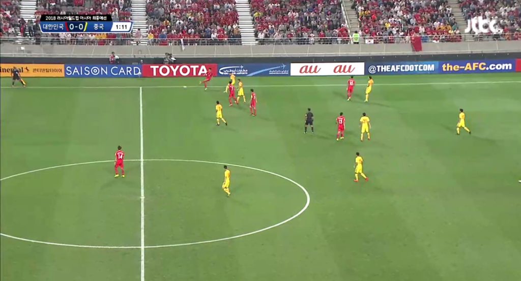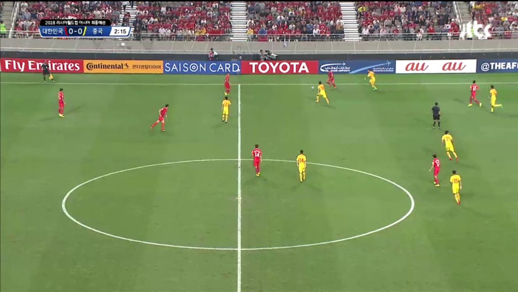 Furthermore, Koo Jacheol often shifted from side to side, or dropped into an area where he could often pick up the ball without Chinese players tightly marking him – the “half-spaces” on either side of the midfield.