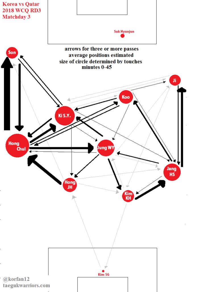 • Korea’s attack was blunted by the Qatari midfield settling into their roles and Korea lost the space and the spark of the first 15 minutes. In a haunting flashback to the China game, Korea contented themselves with passing in a U-shape with no end product or breakthrough. Son Heungmin and Hong Chul were the only penetration Korea had. Rare vertical pass attempts from the centrebacks were often intercepted.