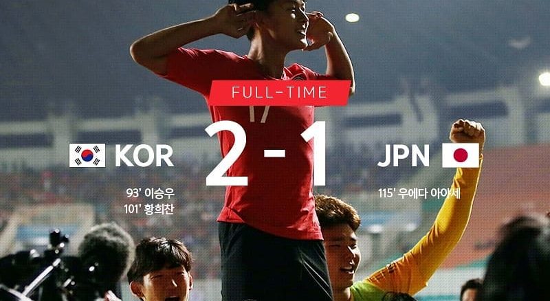 Korea 2:1 Japan at the 2018 Asian Games final — goals from Lee Seung-woo and Hwang Hee-chan ensure military exemption for Son Heung-min, Cho Hyun-woo, … Continue reading Asian Games: Korea Takes the Gold Medal!