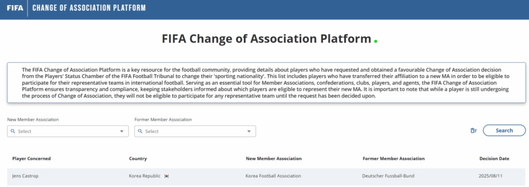 We finally have an answer after years of rumors and speculation: earlier today, 8/11/2025, FIFA approved Jens Castrop’s request to switch international allegiance to South Korea.