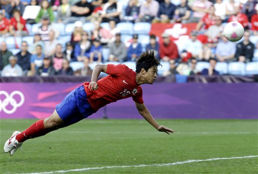 After a goalless draw with Korea dominating most of the opening match against Mexico, the priority was finding the net in the second group match vs. Switzerland. Game was scoreless going into the half. Despite Korea’s dominance in possession, the score provided anybody the game the taking. Second half, the South Koreans kept probing the Swiss defense when Nam Tae-Hee delivered a cross into open space near the penalty area. That day in July, Park Chu-Young flew -arms like wings over the ground, connecting the cross with his head, and with the momentum of flight blasted the ball past the Swiss keeper. He scored the first goal in Olympic action for the Korean side. Park Chu-Young knelt down to thank his maker, then was mobbed by his grateful teammates. Winning the match 2-1, South Korea eventually advanced from the group and faced hosts Great Brittain at the cavernous stadium in Cardiff. Park nearly scored twice from the onset and the Koreans overwhelmed the hosts throughout most of the match. Underestimated and overlooked before the tournament, Korea brought down the hosts in a dramatic overtime penalty shoot out, featuring the minutes old debut of goalkeeper Lee Bum-Young –coming out for the injured Jung Sung-Ryong. Lee breathtakingly blocked Daniel Sturridge’s PK, and Ki Sung-Yueng put it away with the final winning penalty kick. The celebrations began in England and halfway across the world: Korea was two games away from possibly winning the gold medal.