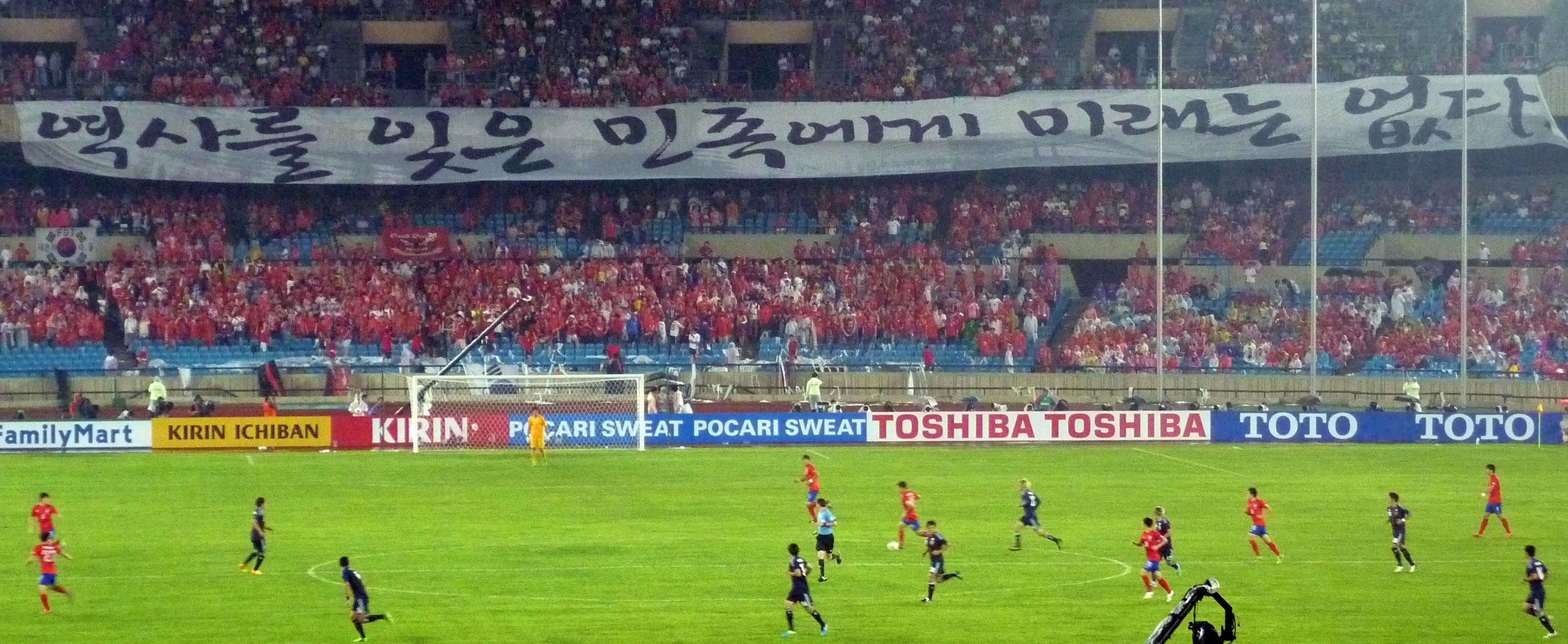 In more recent times, this rivalry, has, however, been all blue. Samurai blue. The past three of five encounters have gone Japan’s way, and Korea hasn’t won since 2010, when Park Ji-sung scored that famous stare-down goal. The 2013 East Asian Cup game – where Korea was practically eliminated but still had the opportunity to strike a fatal blow to the prospective winners Japan – saw Korean nationalist banners being unfurled, with tifo of Korean heroes and slain leaders of resistance to Japanese rule being waved alongside a slogan “A country that forgets its history has no future”. A brace from Kakitani saw Japan prevail 2-1.