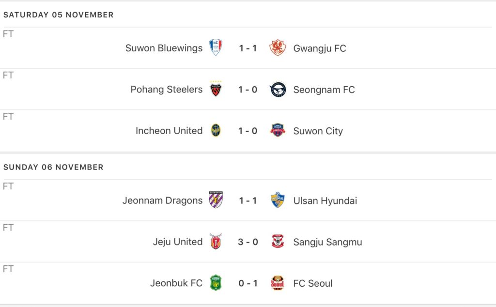 This sets up a promotion playoff over two legs between Seongnam FC and Gangwon FC. The first leg will be held in Gangneung on November 17th, and the return leg is at Tancheon Stadium on November 20th. Will Gangwon return to the Classic thanks to Brazilian firepower (somebody buy their scouts a soju). Or will Seongnam ensure a 28th consecutive season in the top division?