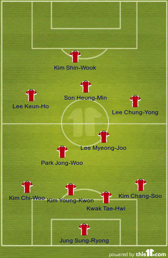 The starting XI was much as expected. Jung Sung-Ryong was in goal. Kim Chang-Soo came in at right back, Kwak Tae-Hwi was partnered by Kim Young-Kwon in central defense, and Kim Chi-Woo kept his left back spot. Lee Chung-Yong and Lee Keun-Ho were once again on the wings. There was a completely new central midfield pairing of Park Jong-Woo and Lee Myeong-Joo. Up top was Kim Shin-Wook and Son Heung-Min. Officially the formation was labeled a 4-2-3-1, and looked like this: