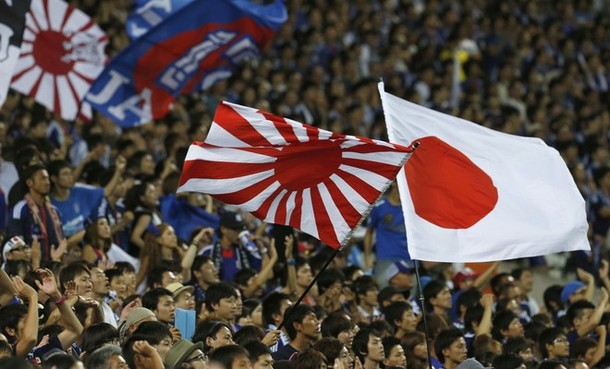 Japan’s soccer fans wave the Rising Sun flags during their 2014 World Cup qualification soccer match against Iraq in Saitama