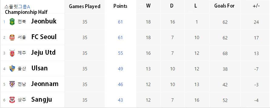 With Jeju defeating Jeonnam in a battle of the 3-5-2 formations (a 5-3 goalfest!), the top half of the table is as follows: