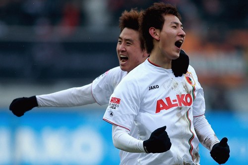 AUGSBURG, GERMANY – FEBRUARY 23: Dong Won Ji (R) of Augsburg celebrates with his team mate Ja-Cheol Koo after scoring his team’s first goal during the Bundesliga match between FC Augsburg and TSG 1899 Hoffenheim at SGL Arena on February 23, 2013 in Augsburg, Germany. (Photo by Johannes Simon/Bongarts/Getty Images)