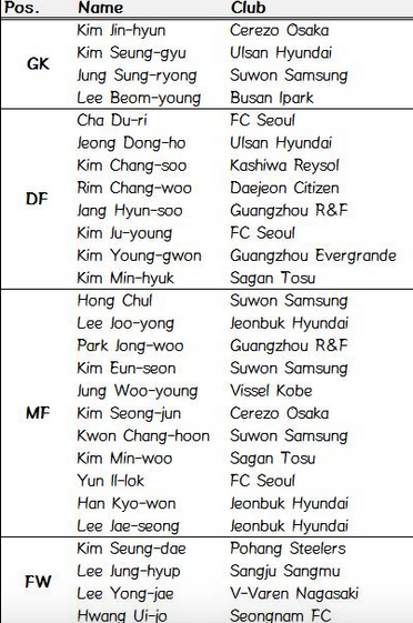 Switching gears now, this just in: Coach Stielike just announced the Asia-based players that will report to Jeju to prepare for the Asian Cup, which is only 36 days away. Here’s the full list, from the Korea Football News Twitter handle: