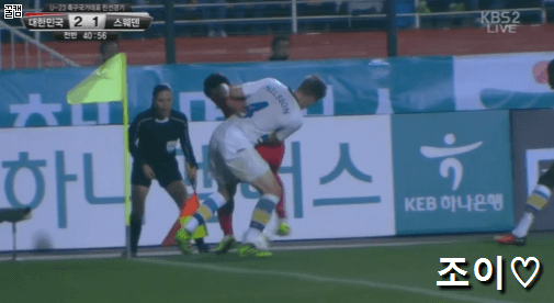 But in the 38th minute Sweden’s GK went way off his line to chase a ball towards the left edge of the PK box. At that distance, it was probably wise to just go back to goal and hope Korea wouldn’t score from it, but instead, the GK followed JHS all the way out… and conceded a penalty.