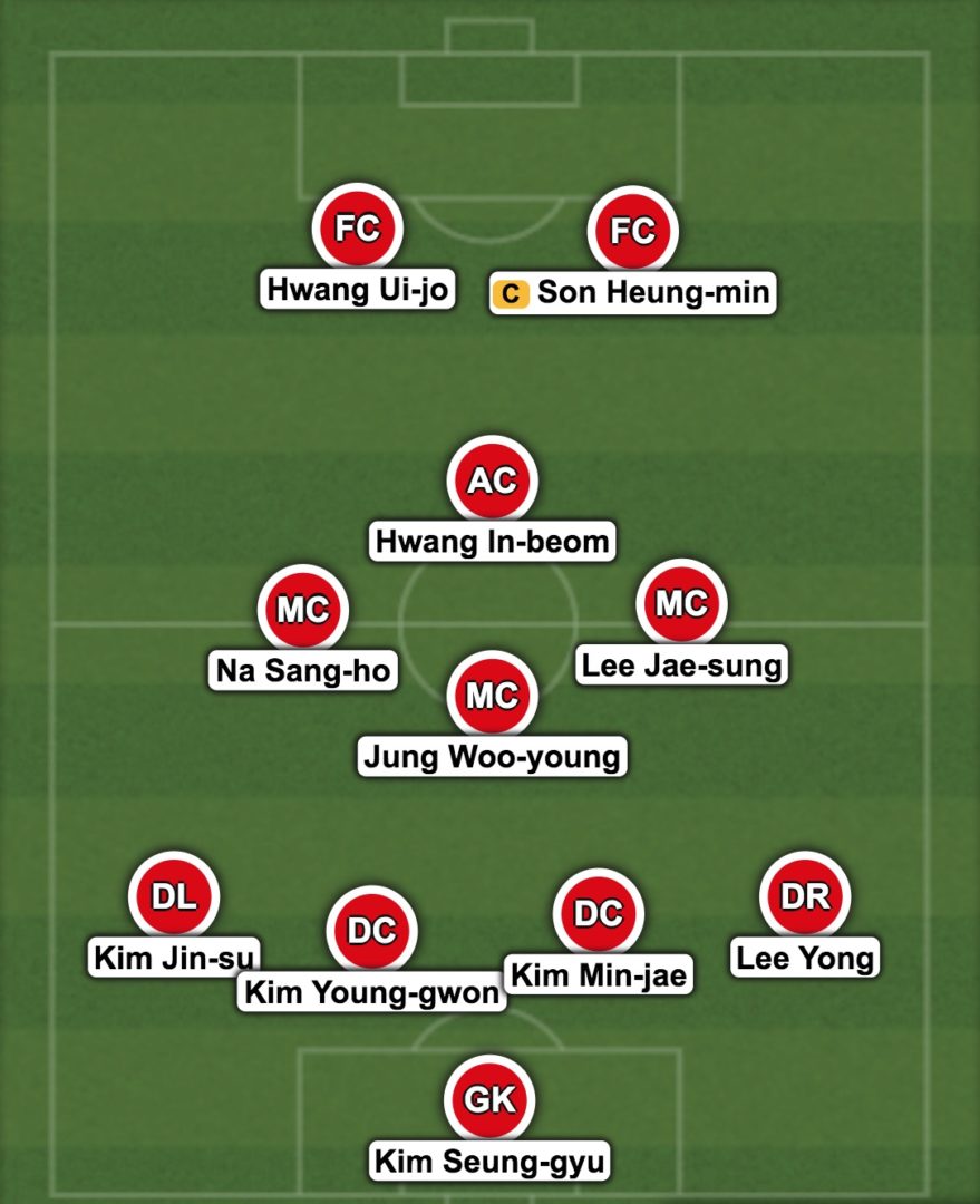 A significant change in personnel to the line-up v Georgia; Kim Seung-gyu, now all but Korea’s starting goalkeeper, started over Gu Sung-yun between the sticks. Lee Yong came in for Park Ji-soo, completing what now seems to be our standard back four. Jung Woo-young, Hwang In-beom, Lee Jae-sung, Na Sang-ho, and Hwang Ui-jo took over for Paik Seung-ho, Kwon Chang-hoon, Lee Kang-in, Hwang Hee-chan, and Lee Jeong-hyeop — thank god for that.