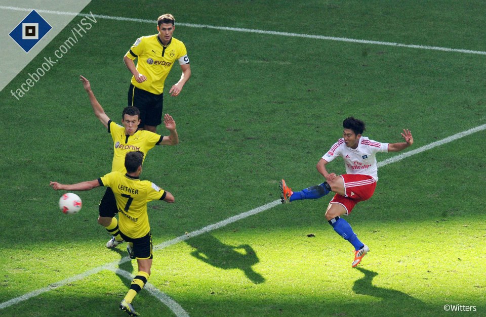 Wow, only 2 minutes in the game with Borussia Dortmund, Van der Vaart’s cross finds Son Heung-Min and he headed it past Roman Weindenfeller. He scored last week, becoming the first Korean to score in Europe this season. Since Rafael Van der Vaart came back to his club Hamburg earlier this month, the Son-Van der Vaart connection has been very effective, first in early test matches, and now for real.