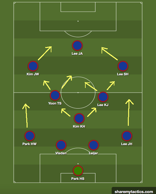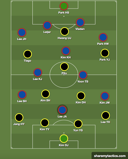 Hwang Ui-jo was the lone center forward for Seongnam. Tiago and Park Yong-ji were on the wings with Pitu operating as a nominal 10. Ahn Sang-hyun was the holding midfielder with Kim Do-heon playing a sort of deep-lying playmaker role next to him. Jang Hak-young and Lee Tae-hee were the fullbacks with Kim Tae-yoon and Yun Young-sun the centerbacks. Kim Dong-jun was the goalkeeper.