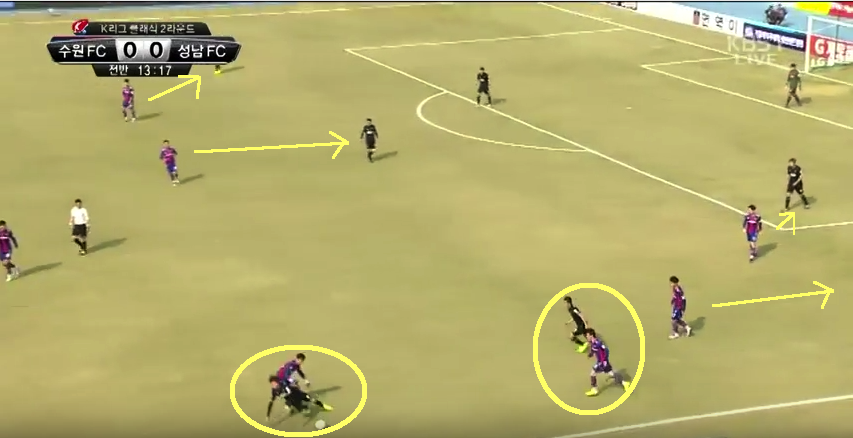 The single most striking thing about this match was the aggressiveness of Suwon FC. Admittedly I didn’t see a whole lot of them last season in the Challenge (other than the two-legs against Busan in the playoffs), but it seems like they’ve taken their pressing and aggressiveness to another level early on this year. The forwards and midfield were relentless in their pressing of Seongnam’s midfield and defense throughout the game. The tactic was highly effective and caused Seongnam a lot of problems.