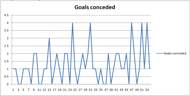 The above graph charts the goals scored (in each game) over the course of the last World Cup cycle. There isn’t too much “enlightening” info in it, but it does clearly show the split between Korea’s more successful first two years of the cycle, and the poorer second half.