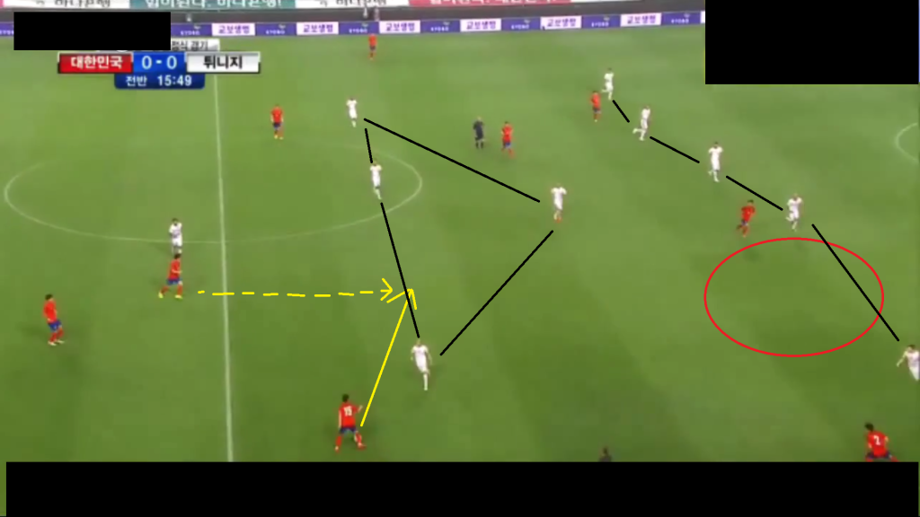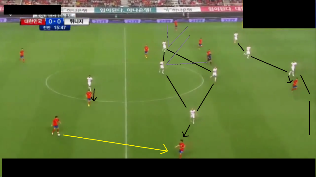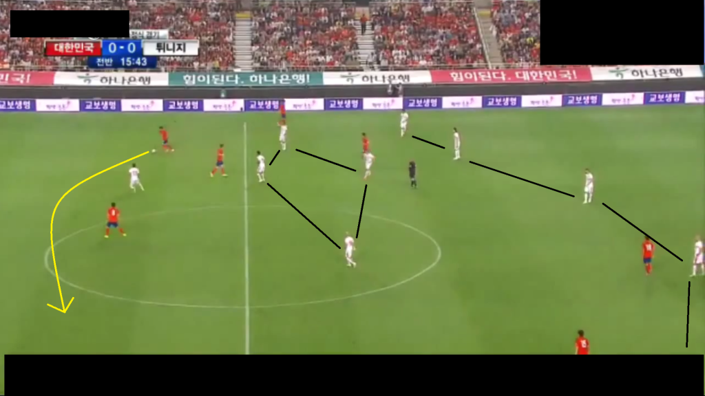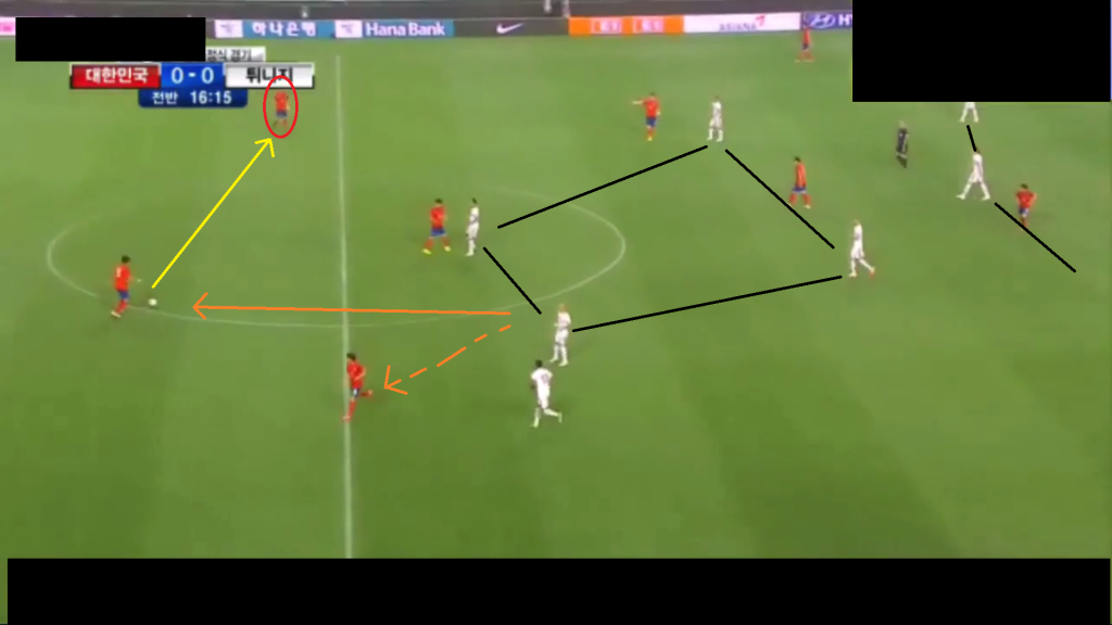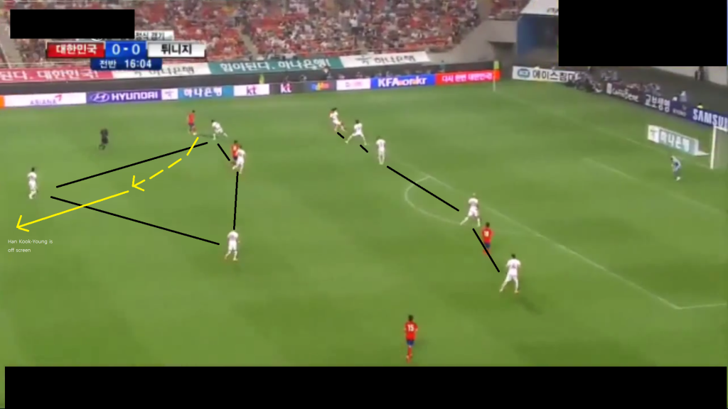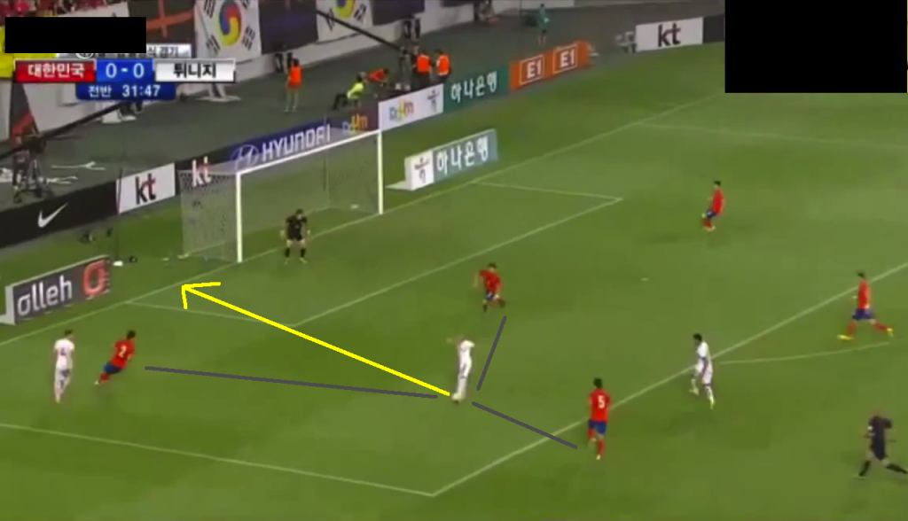 The yellow arrow shows where the pass goes. It’s the obvious, and correct choice, to play it to Yoon Suk-Young who has acres of space on the left. The only other possible option would be over to Lee Yong on the right. If you remember from part 1, this is exactly what Tunisia wanted. For Korea to have the ball on the flanks, but it non-dangerous positions. Kim Young-Gwon could have tried a more ambitious ball, over the top to Park Chu-Young or hard and into the feet of Son Heung-Min, but both of those have little chance of succeeding.