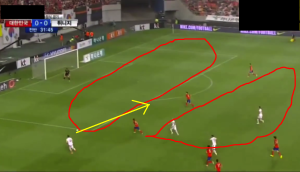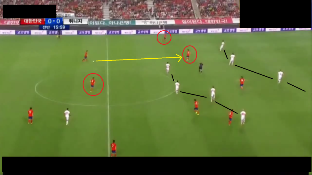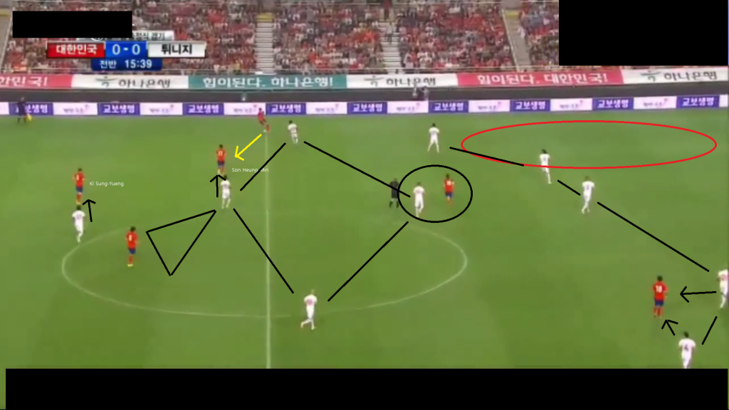 The red circle is the danger area for Korea, but as seen, there is no one there to exploit that space down the flank. The player responsible for this is Son Heung-Min, who has instead dropped slightly deeper to make himself available. If you contrast image 1 with image 2, you can see that Son has gone from being just inside the Tunisia half (a couple yards in front of the Tunisia defense) to being a few yards inside the Korea half. By dropping deeper, Son made the pass easier, but the next move harder. Had he gone with the ‘flow’ of the move, staying along the retreating Tunisia defenders, he would have been in good position to exploit the space down the line. And knowing Son’s pace that’s a race he probably would have won.