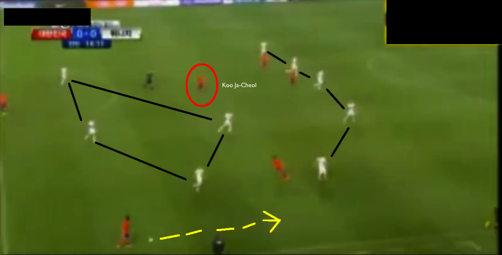 Contrast the previous sequence with the next few images, which show Korea’s one good open play chance from Koo Ja-Cheol. *Note – apologies for the poor quality*