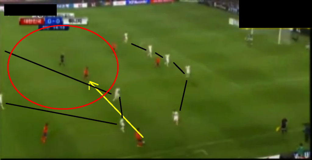 Park Chu-Young’s positioning has taken away all forward options. Two defenders are closing in on him, and he needs to do something immediate. He could pass to Lee Yong (bottom left) or Ki Sung-Yueng (far left), but opts to pass to Kim Young-Gwon (off screen).