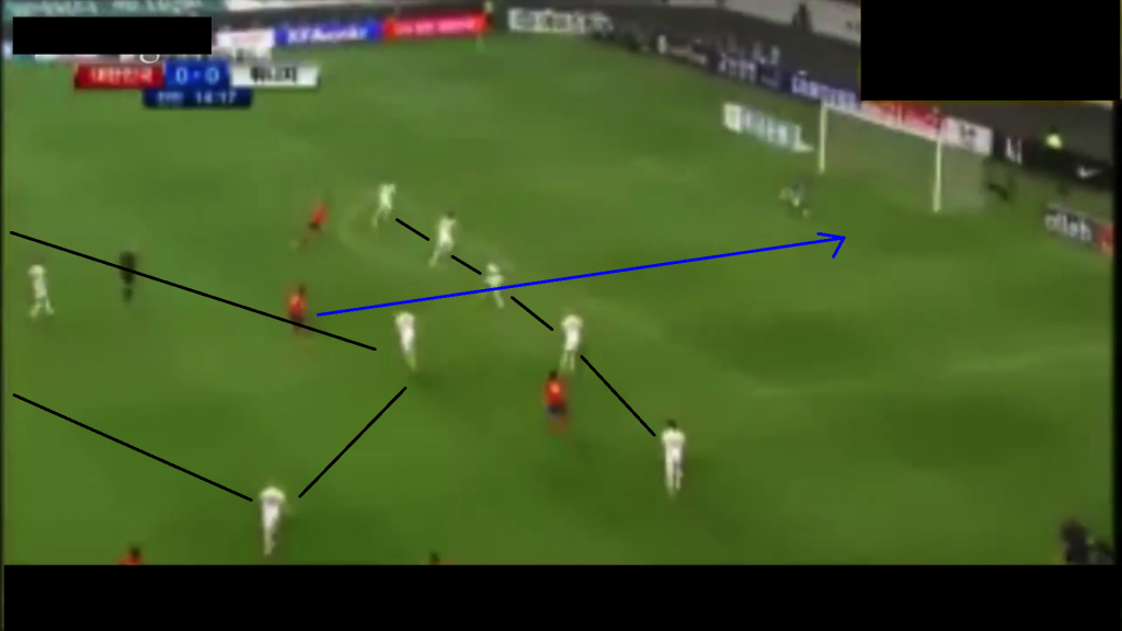The key difference between this image and those of the relative positioning of the midfield diamond and the back line. In Korea’s failed attacks, the diamond stayed compact, preventing anything from coming into the middle, while the back line stretched from side-to-side to deal with the fullbacks. Here, not only has the left side of the diamond stretched, crucially the bottom has stretched as well, leaving the middle open.