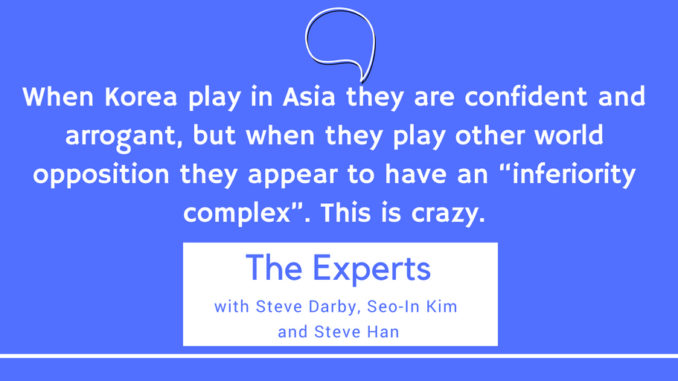 Steve Darby: I think the biggest issue is mentality. When Korea play in Asia they are confident and almost arrogant, but when they play other world opposition they appear to have an “inferiority complex” and don’t play to their strengths. This is crazy as they have world class players in Ki and Son. You don’t play every week in the Premier League or the Bundesliga if you are not world class.