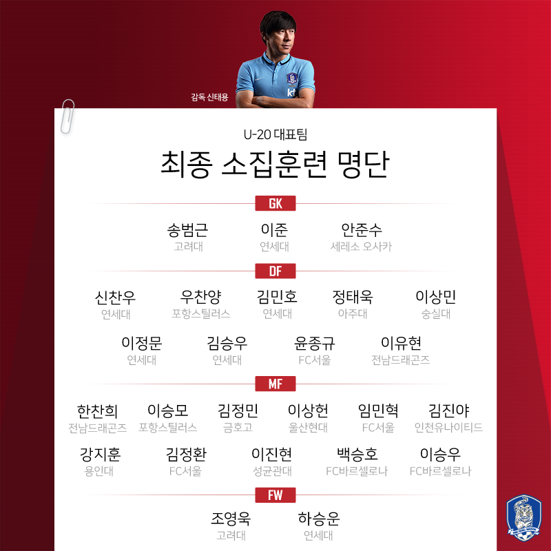 No surprises outside of Lee Jungmoon (new face?). Nice to see Lee Seungmo, Kim Jungmin, Kim Jinya, and Kim Sunghwan back in the squad.