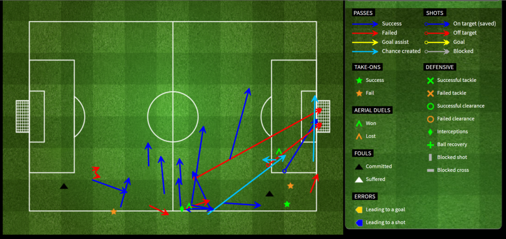 And I encourage everyone to play around with the FourFourTwo stats page – Tim and Jae introduced me to it recently, and it’s actually quite interesting! This one’s for SHM but there’s also one of these for literally every player in every game – whoever came up with this is a genius! Of note for SHM: decent pass accuracy (31/38 overall, 11/16 in the final third), but only 1 successful dribble out of 5. Which makes sense considering he did lose the ball on a number of occasions. And speaking of passing, though SHM had a MotM worthy game (it’s either him or Eriksen), we still need to point out that SHM’s passing is still subpar. He had a very easy throughpass to Alli that should’ve led to a goal, but his pass was not nearly strong enough.