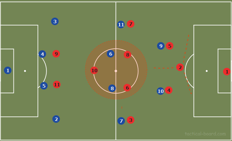 3-5-2 is both the progression from catenaccio, and the response to the tactical trend at the time, the 4-4-2. As illustrated below, the red team has a spare man at the back to cover for either centreback or move up as a ball-carrier, while the central midfield sees a 3v2 overload in favor of red. Without tactical innovation from the blue team, they theoretically have a disadvantage in attack and in midfield.