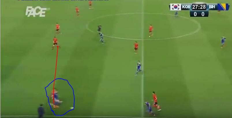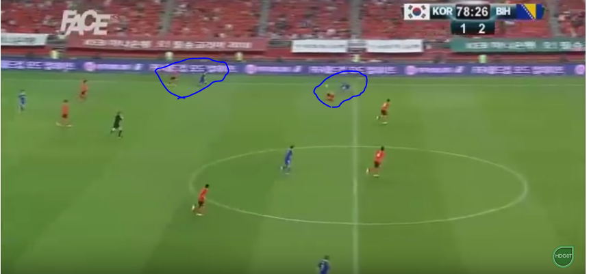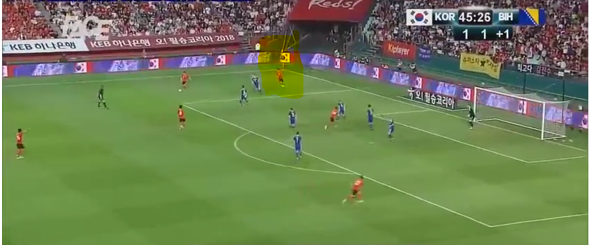Finally, yesterday against Bosnia, all three Bosnian goals came from exploitation of the holes in Korea’s defense, and the inability of our wing-backs to track back down the pitch as quickly as one should in a 3-back formation. Goal number 1: