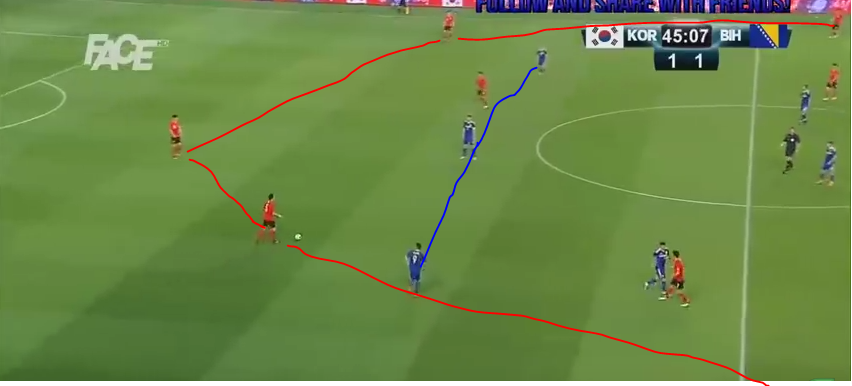 Korean Context: Shin Tae-yong clearly can’t teach the 3-5-2 in the short time-span of international breaks (or whatever homework he assigns players during their club season). Moreover, he’s trialing the 3-5-2 in all the wrong games (against North Korea’s 1 striker, and Bosnia’s 4-3-3 – he was *asking* for the wingers to run behind the wingbacks).
