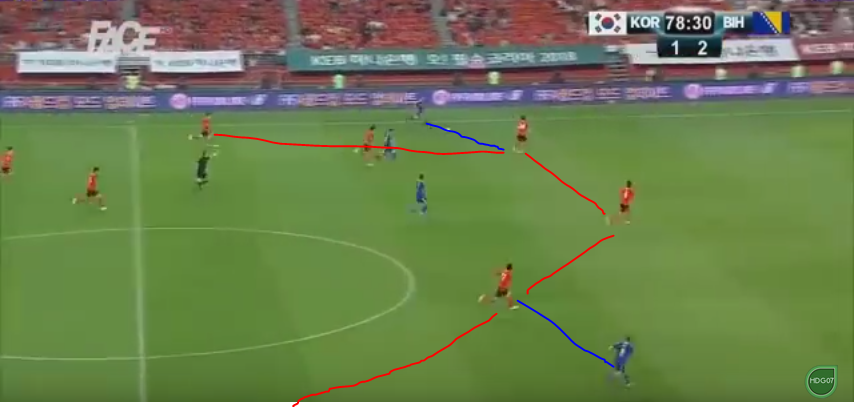 Let’s go over a few examples. October 2017, Korea is down 3-0 to Russia, and their 4th goal sees neither of the three centrebacks take responsibility for any of the two forwards.
