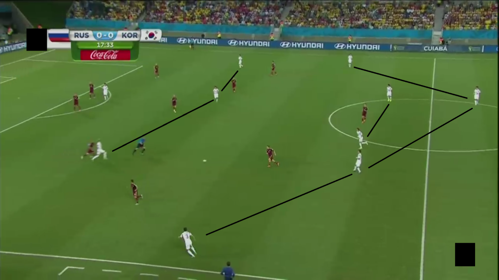 Korea was much better in their transitions and largely was able to control any Russian counters. The major difference was that the fullbacks stayed deeper and they didn’t press as high or aggressively when Russia won the ball.