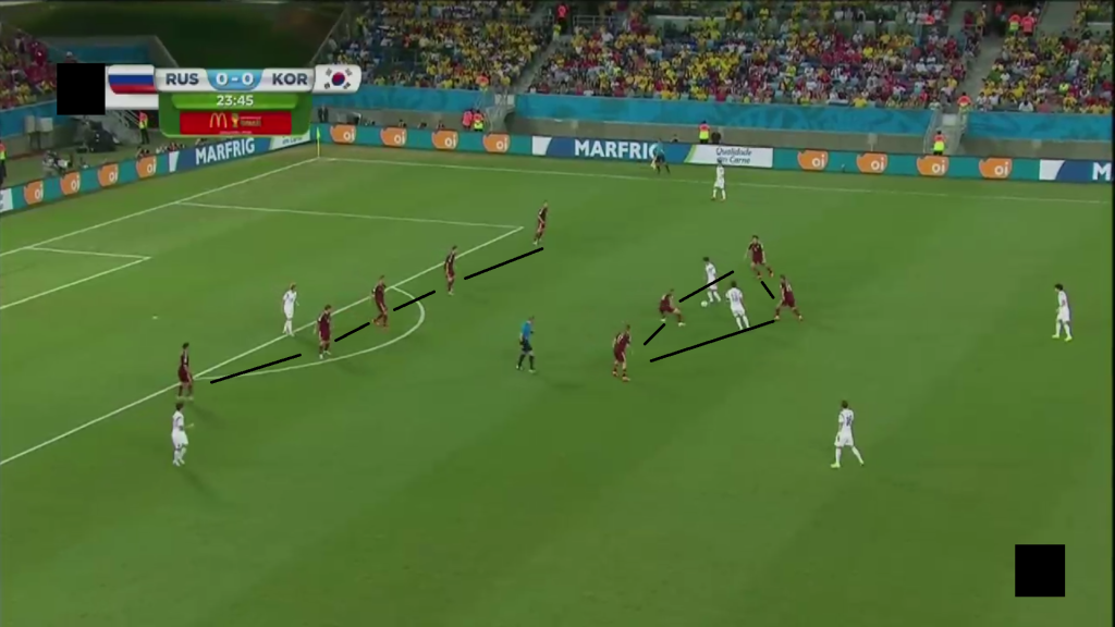 Russia’s defense was somewhat interesting to watch as it shifted as the opposition, Korea in this case, got closer to the Russian goal. When Korea started with the ball deep in their own half, Russia defended in a 4-3-3. As Korea moved up their half, Russia shifted into a 4-4-2. When Korea was around the halfway line, Russia’s defense dropped into a 4-5-1. Finally, when Korea penetrated Russia’s third of the pitch it they shifted into a 5-4-1.